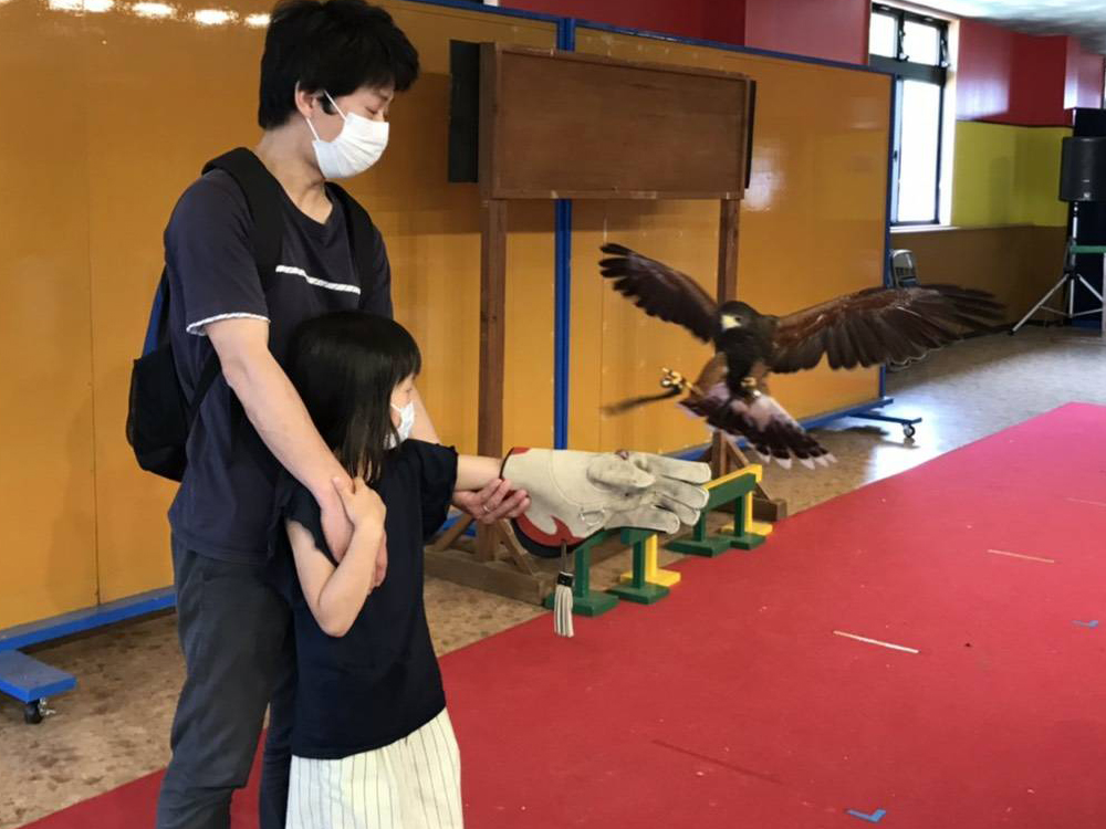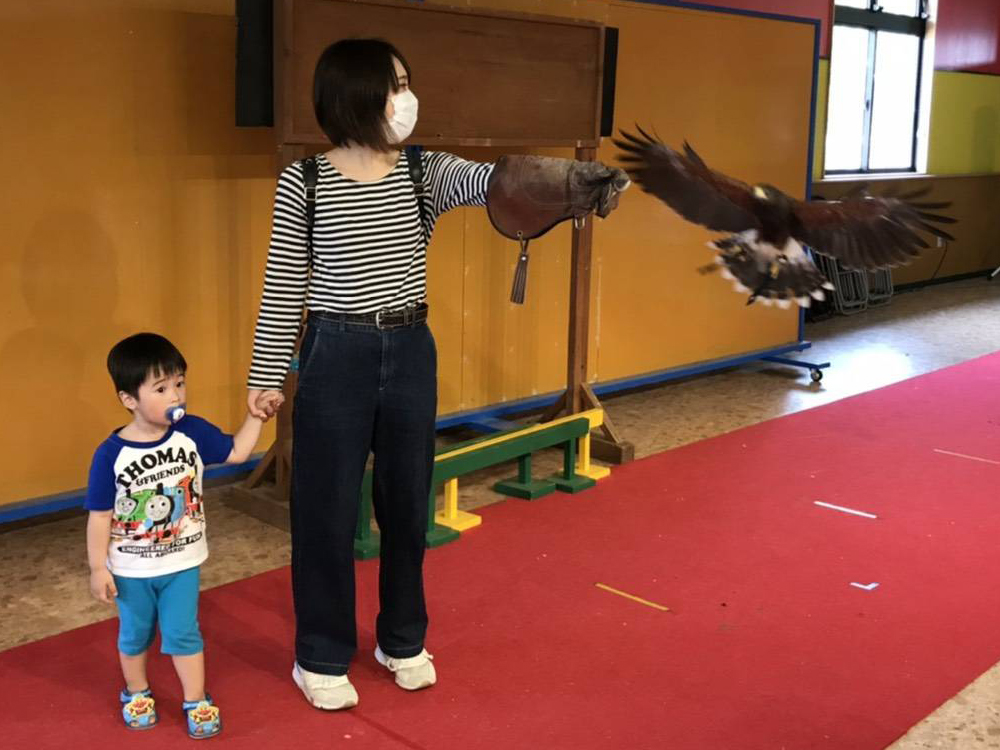 アニマルショーで大人気だった「ハリスホークのフライト」をお客様が体験できるようになりました。するどいくちばしや爪を目の前でご覧いただけます。《ハリスホークのフライト体験》※再開しました